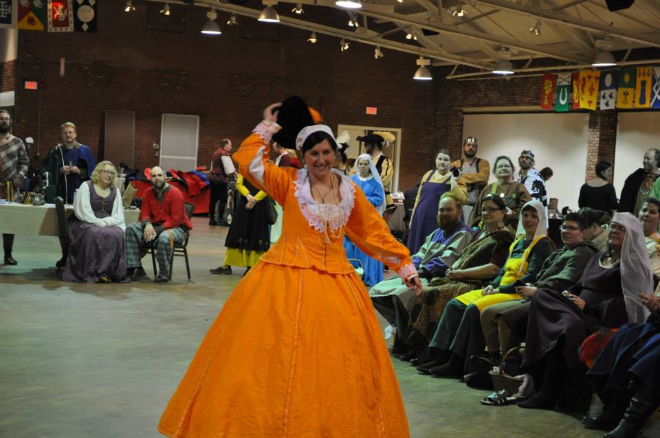 "I made this throwback Tampa Bay Buccaneers-inspired Elizabethan set for an SCA garb challenge. The smock, coif, and corset are made with 5.3oz bleached white, and the jacket and skirt are the 5.3oz flame orange! Drafted and sewn entirely by me."