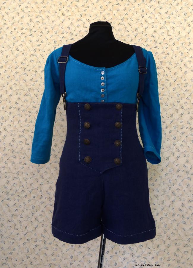 "Double-breasted linen shorts with shoulder straps, and fitted linen blouse, all accented with decorative stitching. Shirt is medium weight IL019. Shorts are heavy weight 4C22."