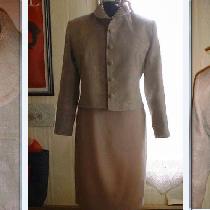 "Last entry! Gift for a friend: Vogue 2212 Bill Blass lined jacket. Linen jacquard (two coordinating fabrics), with reverse side of one of the fabrics also used for yokes and upper collar. Dress is wool crepe, and is not an entry in this contest."