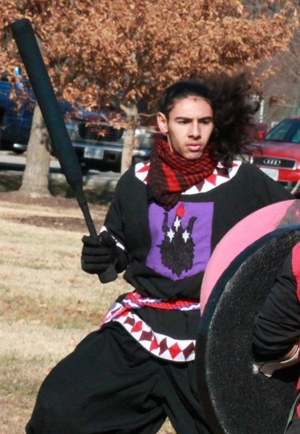 "Live action role play linen tunic with individually pieced linen diamonds on bottom hem, neckline and sleeve hem. Personal symbol in the center on linen is all sewn with zigzag stitching. I did not use a pattern. The tunic was sent to me as a sketch."