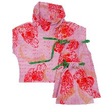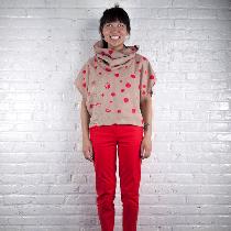 "I'm Karin of Better Than Jam! This linen was dyed with cochineal, then silkscreened with my morse code pattern, fancy chickens, and finally block printed with nubien ibex horn. I made a 5 of my cowl neck tops, and had a little extra for baby dresses."