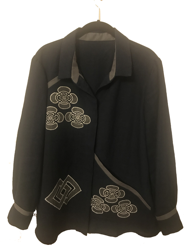 "A shirt, cut from F/S’s new shirt dress pattern and adapted to the short length of vintage Japanese indigo cotton in my stash. F/S dark blue, medium weight linen—an exact match — and dark gray bias linen trim completed the shirt."