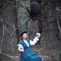 "All three layers were made using Fabrics-store.com's marvelous linens. A petticoat made with unbleached linen, a blouse with bleached IL-019, and the overdress with a lovely blue linen. The blouse has a scalloped sleeve finish instead of hemming."