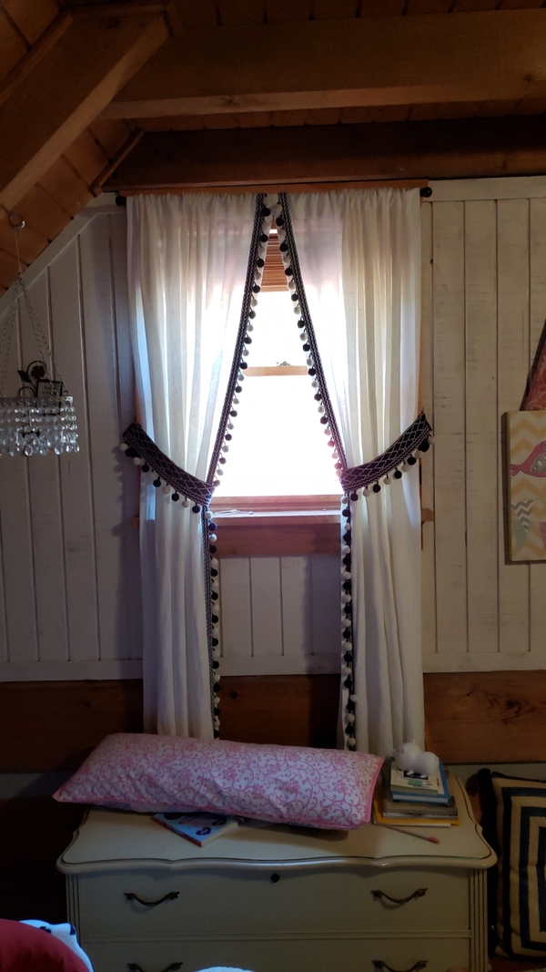 "My 12 yr old granddaughter picked out this beautiful white linen embellished with white/navy pompom balls. My not so talented son-in-law hung this treatment. "