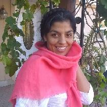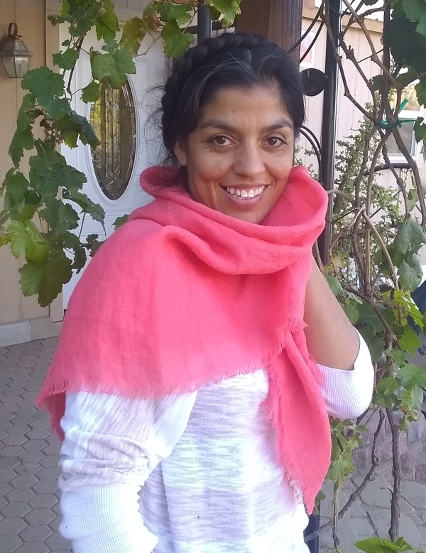 "While visiting friends in hot hot hot Southern California this summer, I wanted to make a bright colored yet cool scarf. This was made with just a pair of scissors and a pin to pick a 1/2 inch fringe all around a 36 x 36 inch square of IL030 Softened."
