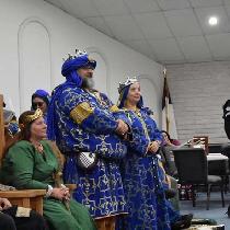 "12th Century block printed Turkish garb made for our stepping down as Baron and Baroness in our SCA group. The fabric is hand printed using a block that I designed based on Seljuq ceramic tiles and the Heraldry of our group."