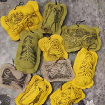 "Home Decor Linen Christmas Ornaments made from left over linen pieces and block printed with some of my Christmas block prints. These will be gifts for my Mom's Hospice team. I wanted to fray the edges but decided to let them fray over time with use."