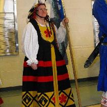 overgown in Royal Blue 4C22, Red accents in Crimson red IL-19. Start front in more of the royal blue with appliques in white. Skirt is 6 yards Cartridge pleated. Wonder Woman themed garb for going to visit kids at our local hospital for story time.