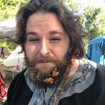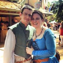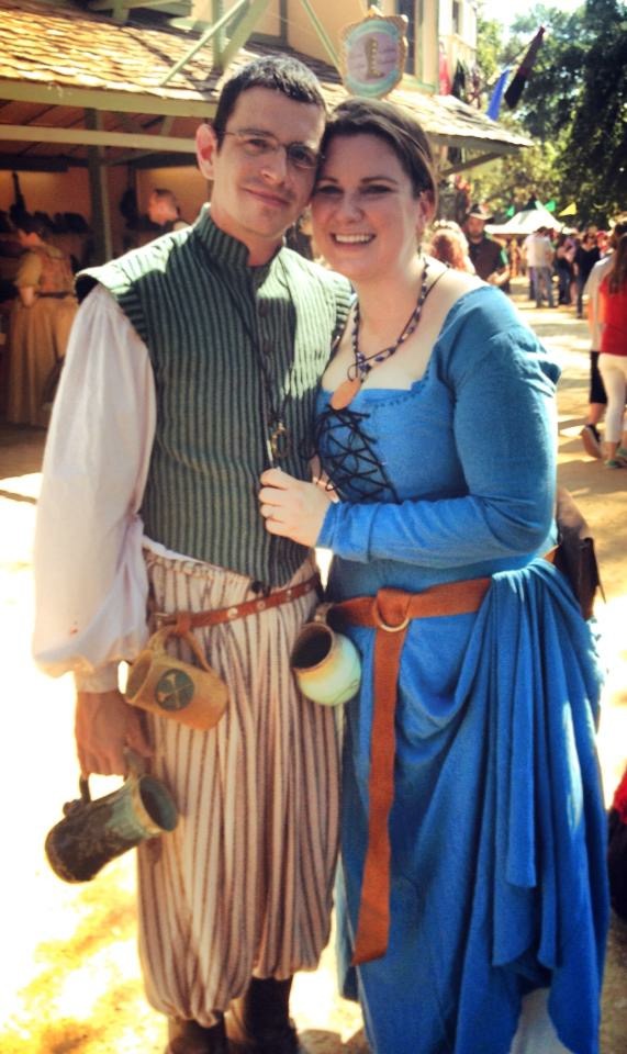 Jessica, Mens linen shirt, linen rus pants, brocade jerkin. Womens kirtle in hand dyed raw silk.