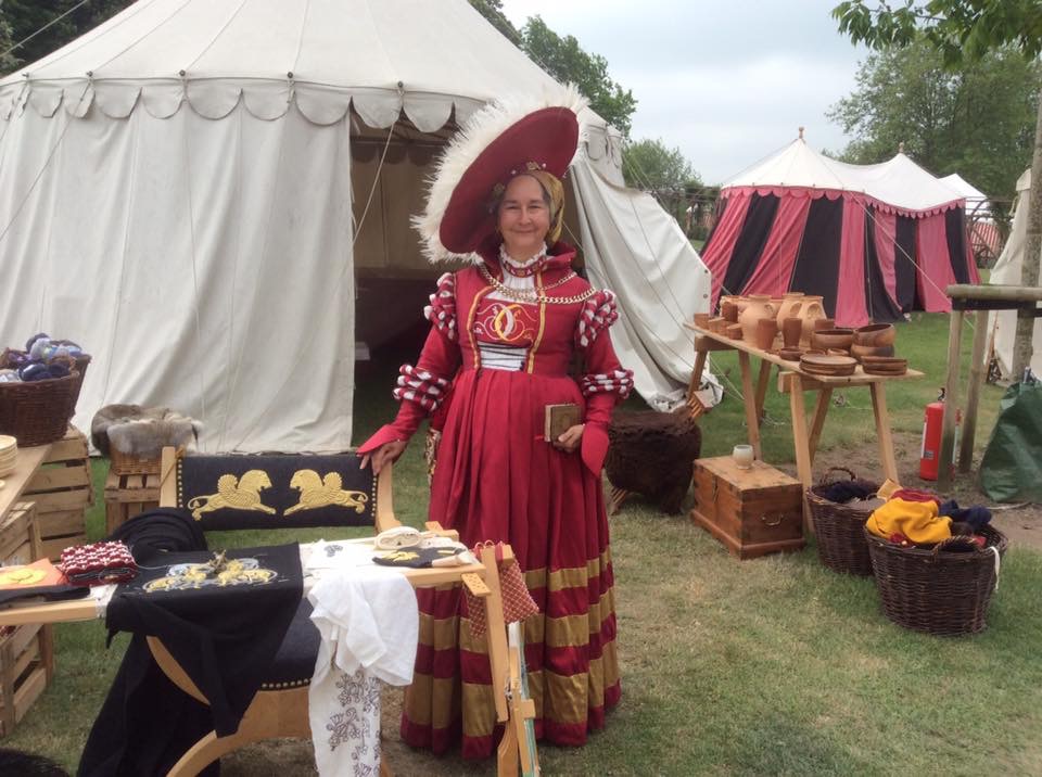 "A Cranach dress made in silk and linen. It is mostly handmade with fine thin linen and handwoven old linen as support. Raised goldwork and pearl embroidery. The shirt is in fine hand pleated linen. Under the dress is a linen skirt and a corset."