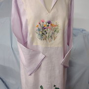 "I wanted to leave this world(eventually)in all natural fibers. The insert in this dress was IL020 bleached but then dyed with avocados. Embroidery was traced on and done before sewing. The body was IL019 dyed, sewn, and further embroidered including cuff"