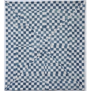 "I botanically dyed your beautiful fabric with indigo and also the exhaust from a vat of logwood and iron. I sewed a classic alternating block pattern, cut it up and sewed it back together to make a modern quilt. Hand quilting a block pattern finished it"
