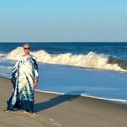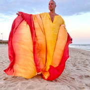 ""I hand dyed 15 yds of handkerchief linen in an ombre sunset color way to create this double width panel Caftan. I created ruched the shoulders with orange rattail cording as drawstrings. I wore it in Fire Island Pines beach, NY to great reactions!""