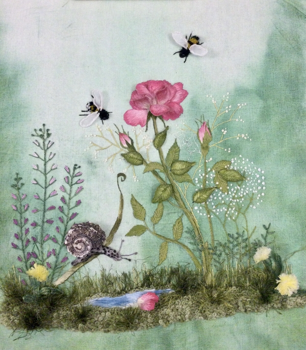 "I hand dyed the fabric in shades of greens, first by dyeing the fabric an all over light green then adding darker colors of green with a sponge ,I then embroidered a garden using different threads and stumpwork . It comes with a snail made from a seashel."