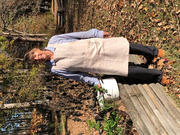 "Crossed back, no tie Japanese apron from 4C22 heavy bleached linen (7.1 oz/sq. yd) Dyed the fabric with natural cochineal, guided by Kathryn Davey’s site. It is a lovely mauve-pink. Soft and strong."