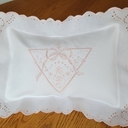 "12"x16" linen pillow with "whitework" done in pink floche. All embroidery (cutwork, eyelets, granitos, scallops, and satin stitch is done by hand while pillow construction is by machine."