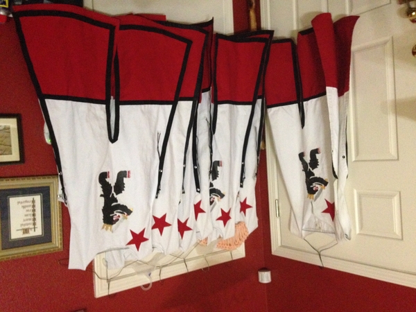 "Re-enactments. This is surcoats for California grizzlies Armored Combat League (ACL) made with heavy white and red linen. Black edging is cotton twill tape and star is linen appliqué on and grizzly is painted."