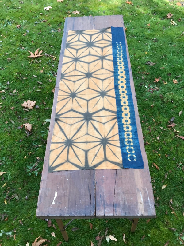 "ILO19 linen shibori tablerunner in hemp leaf pattern dyed with iron, pomegranate, and indigo"
