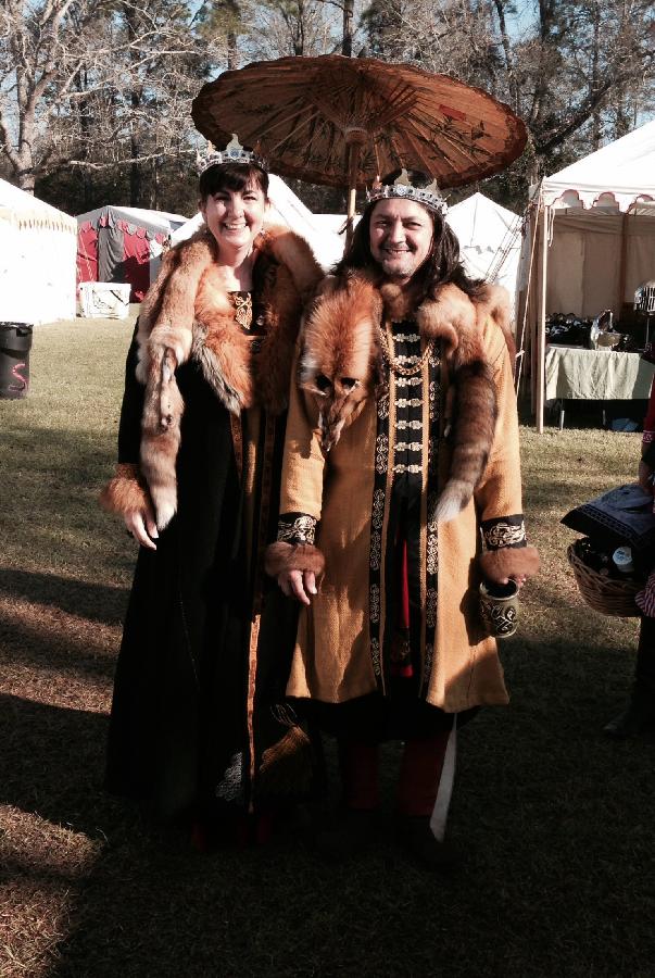"Norse clothing. Linen tunics, men's kaftan, and woman's apron dress. Wool female caftan. Silk fabric for trim. Fox and mink fur collars and cuffs. Gold pieces are hand sewn with hand finished seam finishes. "