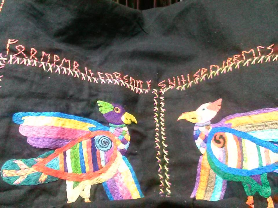 "Detail of my black linen viking apron dress. The runes translate to "forever in pursuit of shiny squirrels""