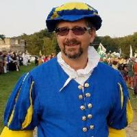 "7.1 oz Linen in Royal Blue with yellow accents. This is a modified pattern based on Period Patterns 56, view II. "