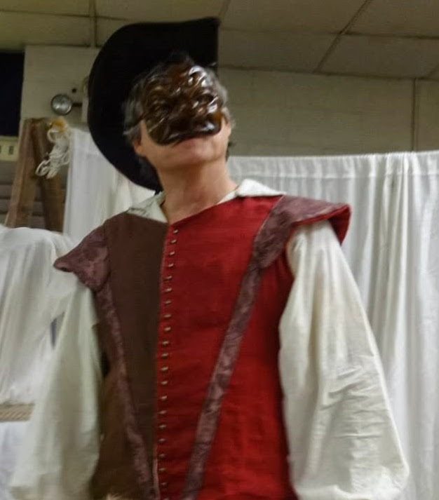 "The jerkin is made from 2 layers 5.3 oz linen and one layer 7.1 oz linen. Shirt is 5.3 oz linen. The accents are made from something I found at Goodwill and the buttons are brass. The garb is SCA legal for fencing but, here, I am Capitano Spavento...."