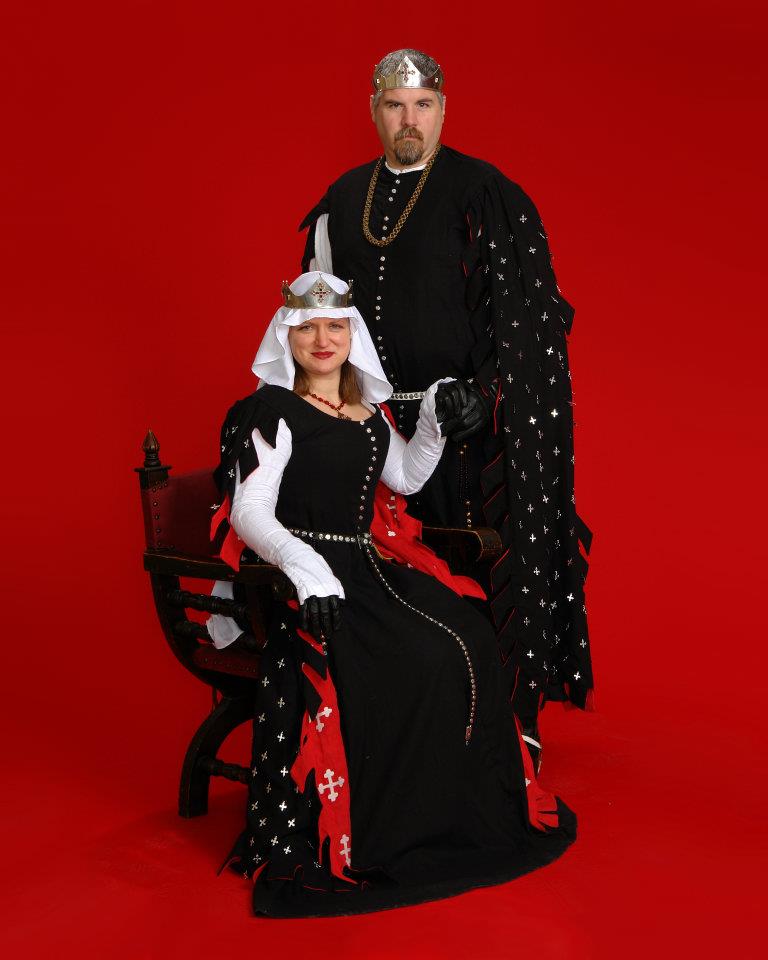 "14th century drop-sleeve Houppelande and Gothic Cotehardie based off of The Tres Riches Heures of Jean, Duke of Berry. Made out of All purpose linen, IL019 Black, Bleached, & Firecracker Red"