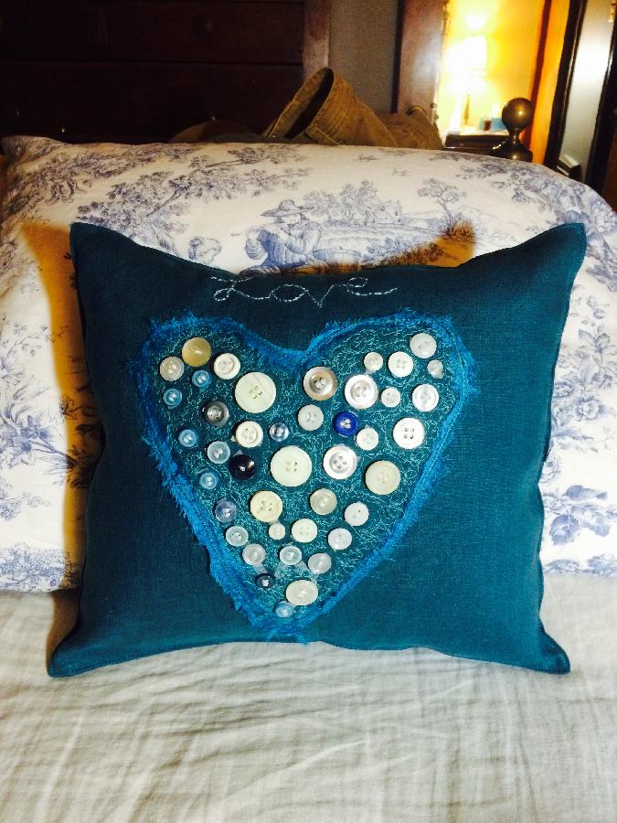 "Sphinx IL019 linen, free-motion embroidery with random buttons and silk sari strip embellishments."
