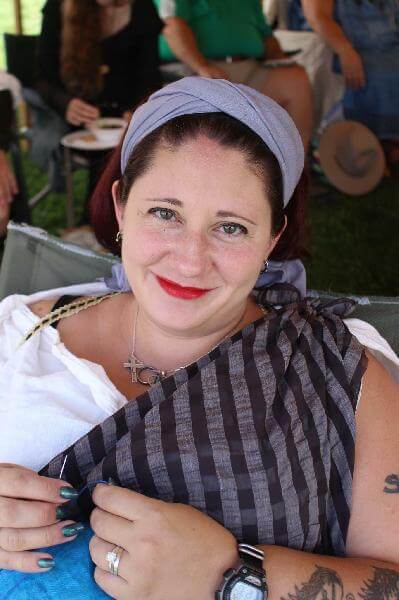 "The dress is a 14th century gown and sideless surcot based on a ca1390 statue of Jeanne de Bourbon at Palais Ducal, Poitiers, France. He is clothed in a 14th century tunic, hose and surcote."