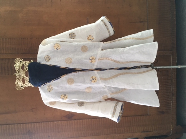 "Kimono with flounce textured with double threaded all over design, accented with silk necktie polka dots and bias binding"