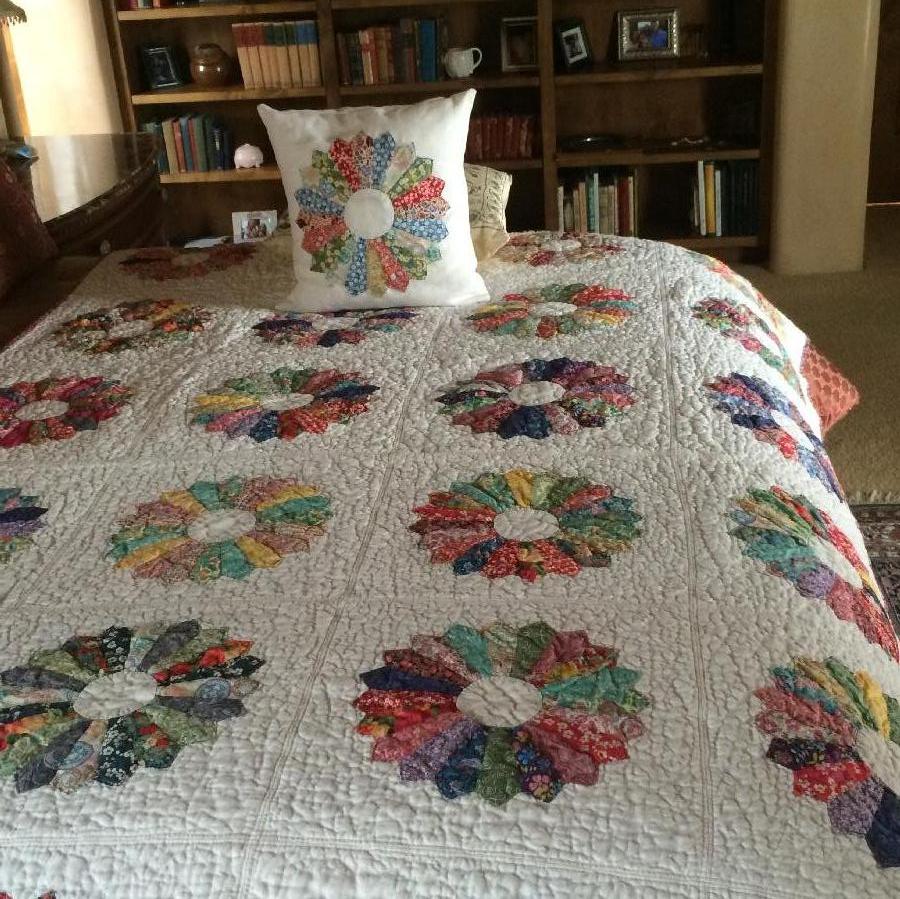 Ronda, Dresden Plates on a white linen background with matching pillow.