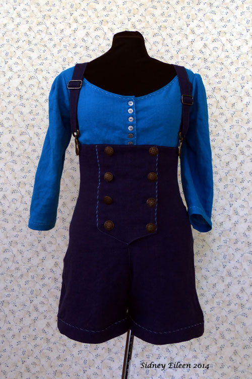 "Double-breasted linen shorts with shoulder straps, and fitted linen blouse, all accented with decorative stitching."